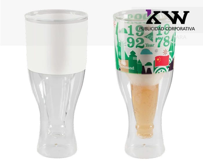 Copa mediana de vidrio de doble pared, base interior flotante en forma de botella de cerveza. Capacidad doce onzas. Presentación: caja en color blanco.