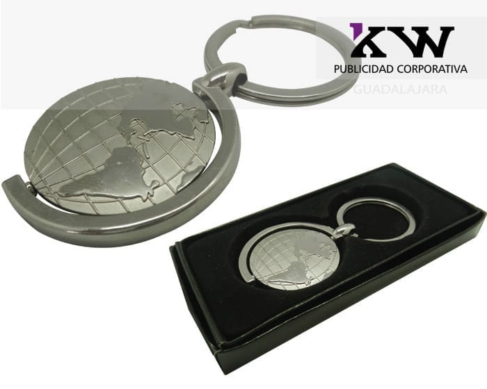 Llavero giratorio metálico. Una cara con forma de planisferio y la otra para grabado de logo.